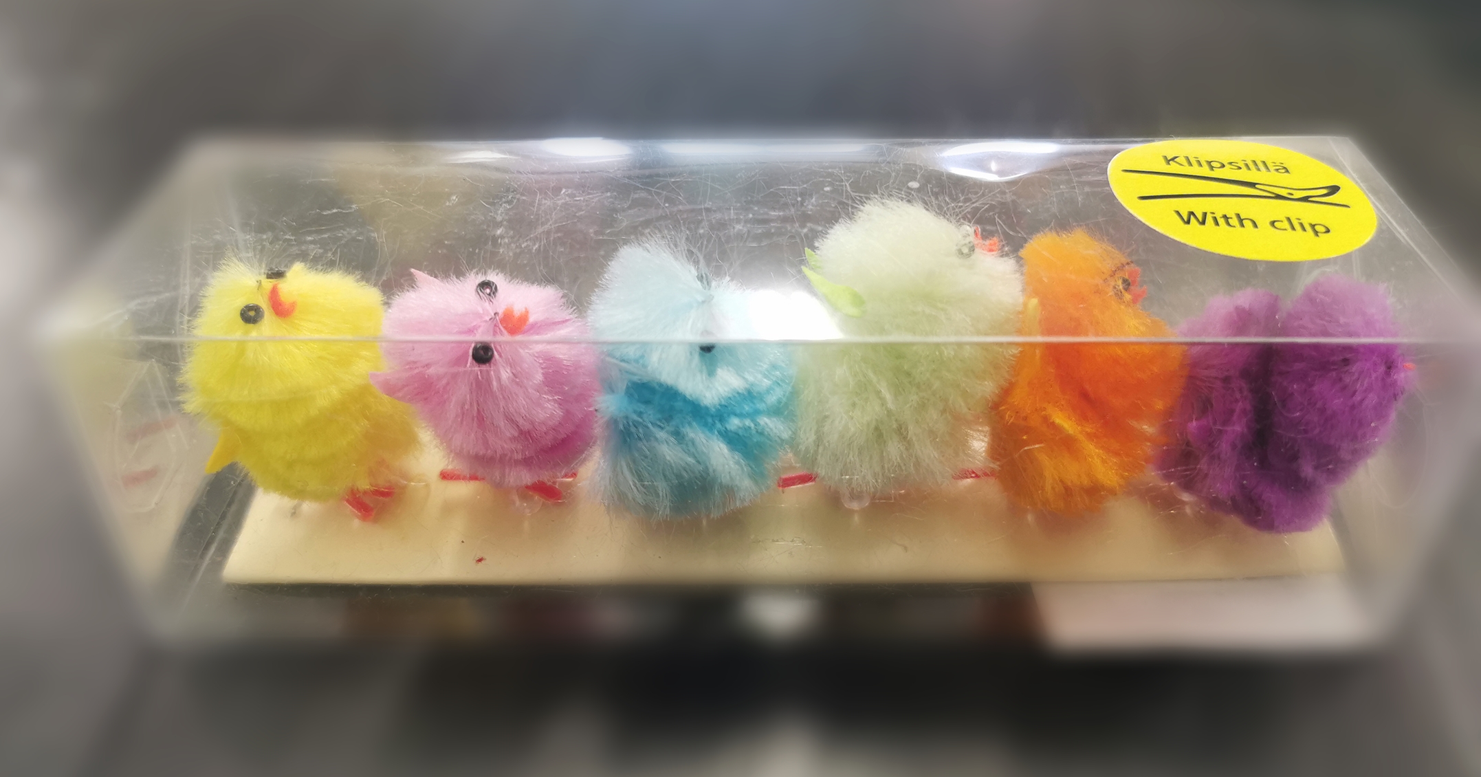Små kyllinger til påskedekorasjoner. Kyllingene har klips slik at de enkelt kan festes. Høyde ca 3 cm.