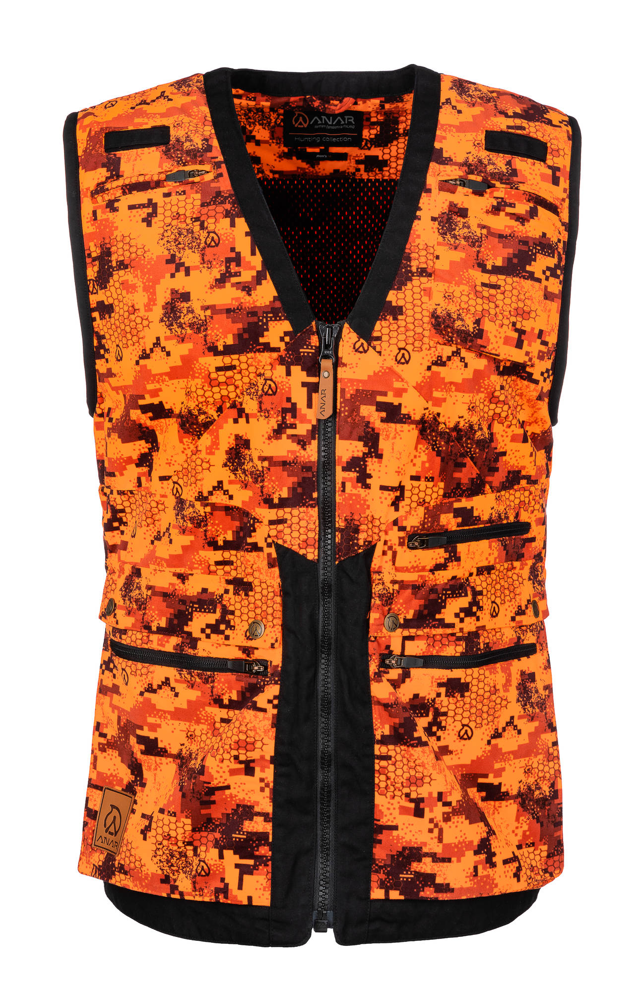 <p>Anar Bear Pro jaktvest er designet i samarbeid med profesjonelle bjørnejegere. Vesten er utformet for å imøtekomme behovene til selv de mest kresne jegere under jakten. Vesten er laget av et mykt og stille børstet materiale, med farge og mønster for å kamuflere jegeren fra dyrets syn. Den lys oransje fargen oppfyller de nyeste lovkravene og forbedrer synlighet og sikkerhet under jakten. Romslige og funksjonelle lommer gjør det enkelt å bære med seg nødvendige gjenstander i skogen. Stilfulle detaljer av vokset stoff foran og nederst på vesten gir ekstra støtte. Elastikk i midjen på baksiden sikrer en utmerket passform.Myk og stille børstet materialeGodt kamuflerende digital camo-mønster designet i FinlandMesh-fôr forbedrer fukttransport fra lagene underTre romslige frontlommer med glidelås, ammunisjonslommer nederstTo brystlommer med glidelås for radiotelefoner, med antenneholdere overInnerlomme med glidelåsVill-/utstyrsrom på baksiden med tilgang fra begge siderMetall-D-ring på siden for ulike utstyrElastikk bak i livet sikrer god passformKvalitets YKK-glidelåserDesignet og testet i Finland</p>