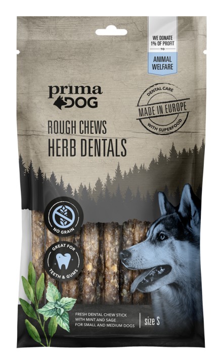 <p>PrimaDog Rough Chews Tannpleiepinner urter er en smakfull tyggepinner for hundens tenner og tannkjøtt. Tyggepinnen laget av oksehud gir selv små hunder en delikat aktive tidsfordriv med naturlig atferd. Urtene i oppskriften sørger for frisk pust hund. Kornfri og uten konserveringsmidler, Rough Chews tannpleiepinner er rike på protein og lite fett. Fremstilt i vår egen fabrikk i Europa med kompromissløs kvalitet. Ingredienser Sammensetning: Oksehud 98 %, mynte 1 %, salvie 1 %. Næringsinnhold: Råprotein 89 %, råfett 2,9 %, mineralstoffer 1,2 %, råfiber 1,5 %.</p>