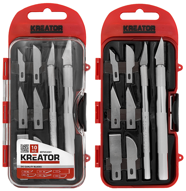 <p>-For presis skjæring, 10-delt knivsett<br/>-8 forskjellige blader<br/>-2 håndtak<br/>-Blader laget av SK5-stål<br/>-Håndtak av aluminium</p>