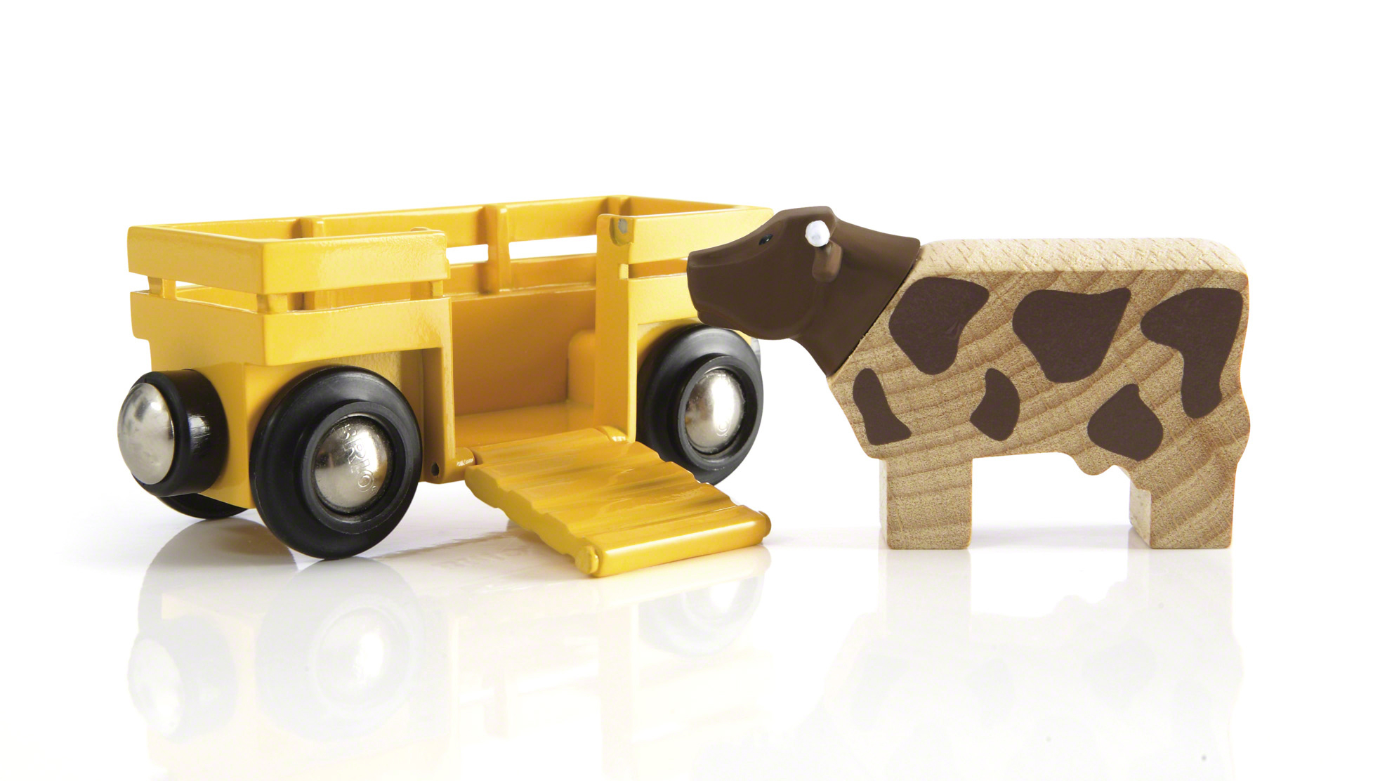 Ku reiser i sin egen kreaturvogn bak BRIO-toget. Hjelp kua ombord ved å åpne rampen på vognen. Lukk rampen og sørg for at kua holder seg sikkert på plass under reisen. Pakken inneholder kreaturvogn og ku. Anbefalt alder 3+ Produsentens produktnummer 33406