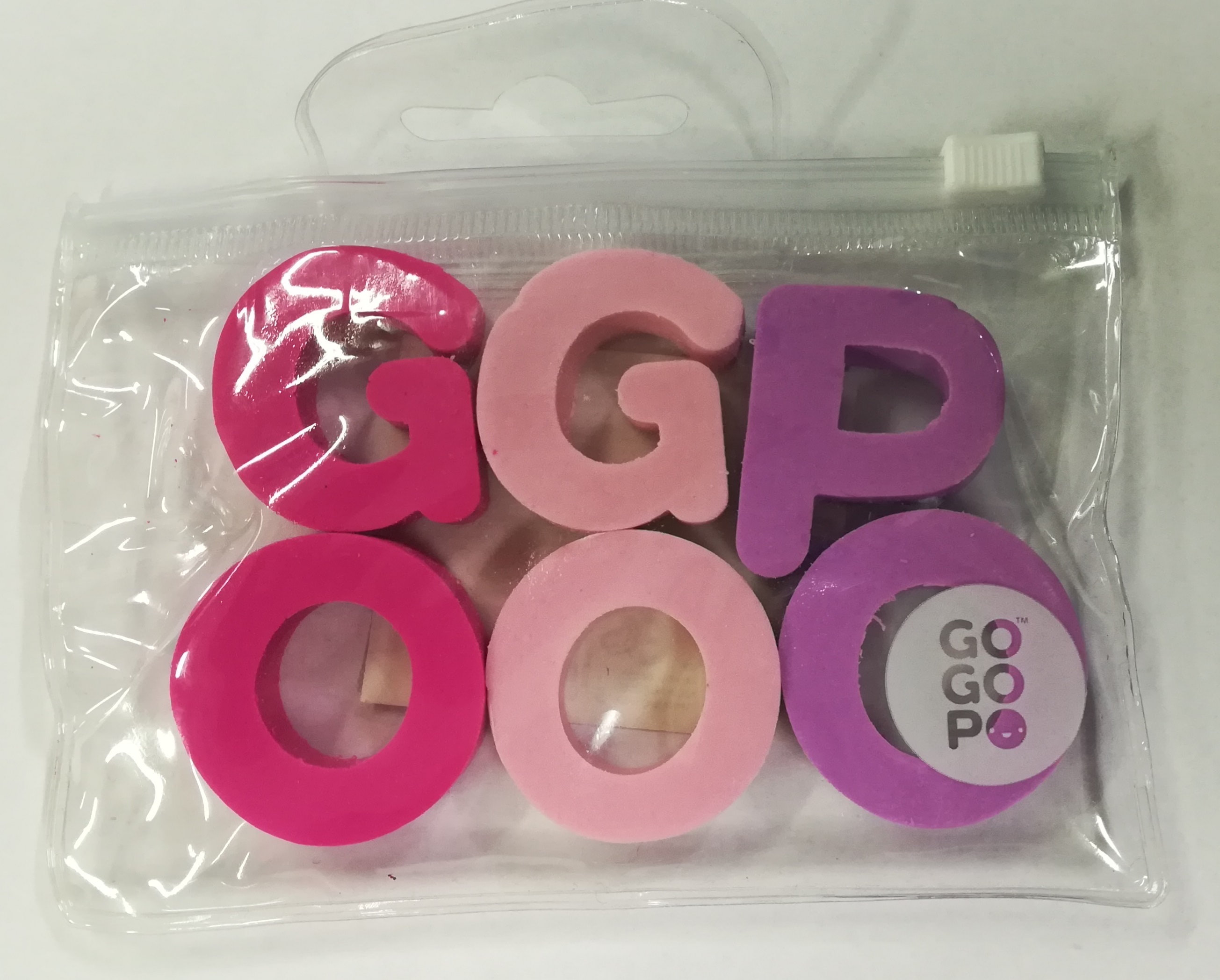 Morsomme bokstavgummier som danner ordet 'GoGoPo'. 6 stk i pakken. Farger: Rosa, fiolett, lys rosa.