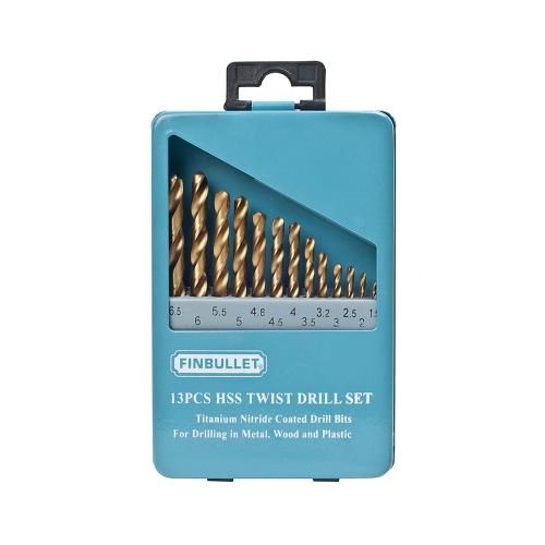 Finbullet høykvalitets HSS bor sett for metall, tre og plast. Boret er belagt med titan nitrid, som forbedrer levetiden. Størrelser: 1-6,5 mm. Materiale: HSS. Belegg: Titan nitrid. DIN 338 godkjent.