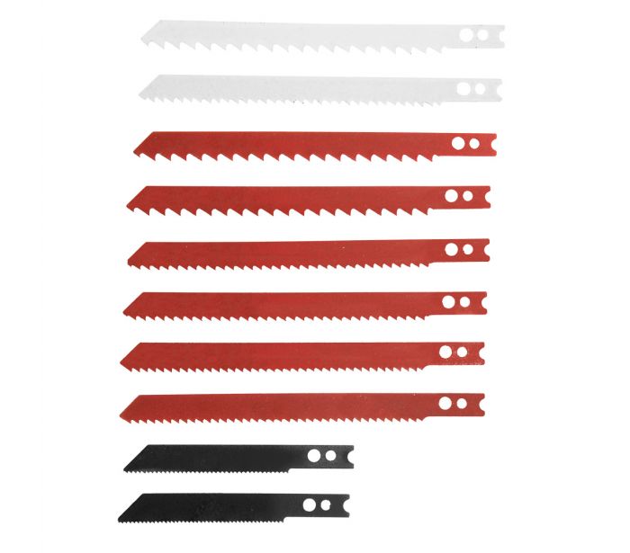 Stikksagbladsett. Totalt 10 blader. Skjærer tre, plast og metall.